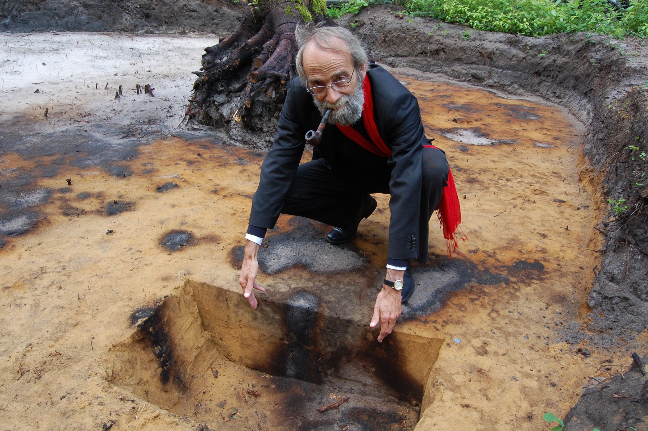 Der rote Schal war und bleibt ein Markenzeichen von Dr. Daniel Bérenger, der hier das Thema vor Augen führt, was ihn zu einem Fachmann weit über die westfälischen Grenzen hinaus gemacht hat: Die Erforschung von bronzezeitlichen Grabhügeln.