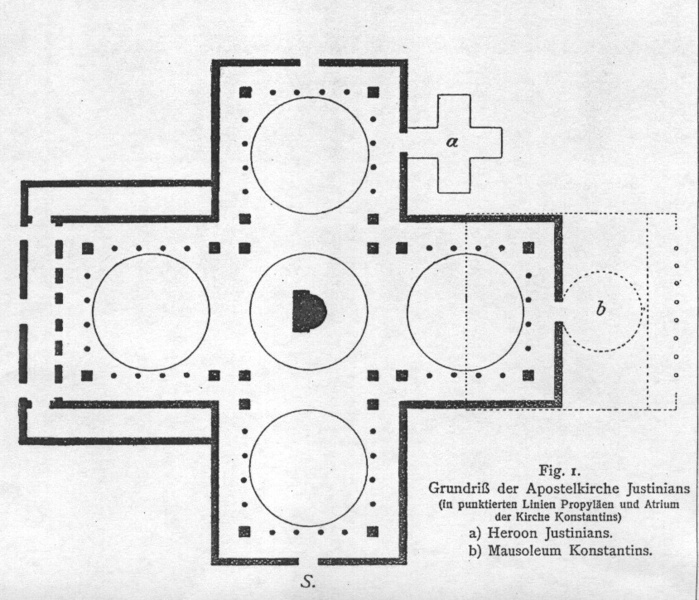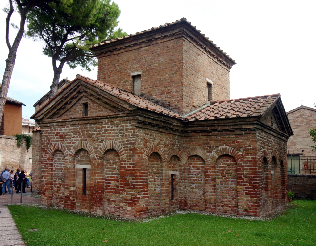 Grabeskirchen bzw. Mausoleen waren in der frühchristlichen Architektur nicht unüblich. Seine eigene Grabeskirche – die Apostelkirche in Konstantinopel – hatte Konstantin I. († 337) nach Gregor von Nazianz in einer kreuzförmigen Gestalt errichten lassen. Unter Justinian erfolgte ein Neubau. Berühmt ist auch das von vielen Touristen besuchte Mausoleum der Galla Placidia in Ravenna. Dieses ist um 450 entstanden. Das digitale Bild von Boris Nasdalack erinnert an diesem Bau.