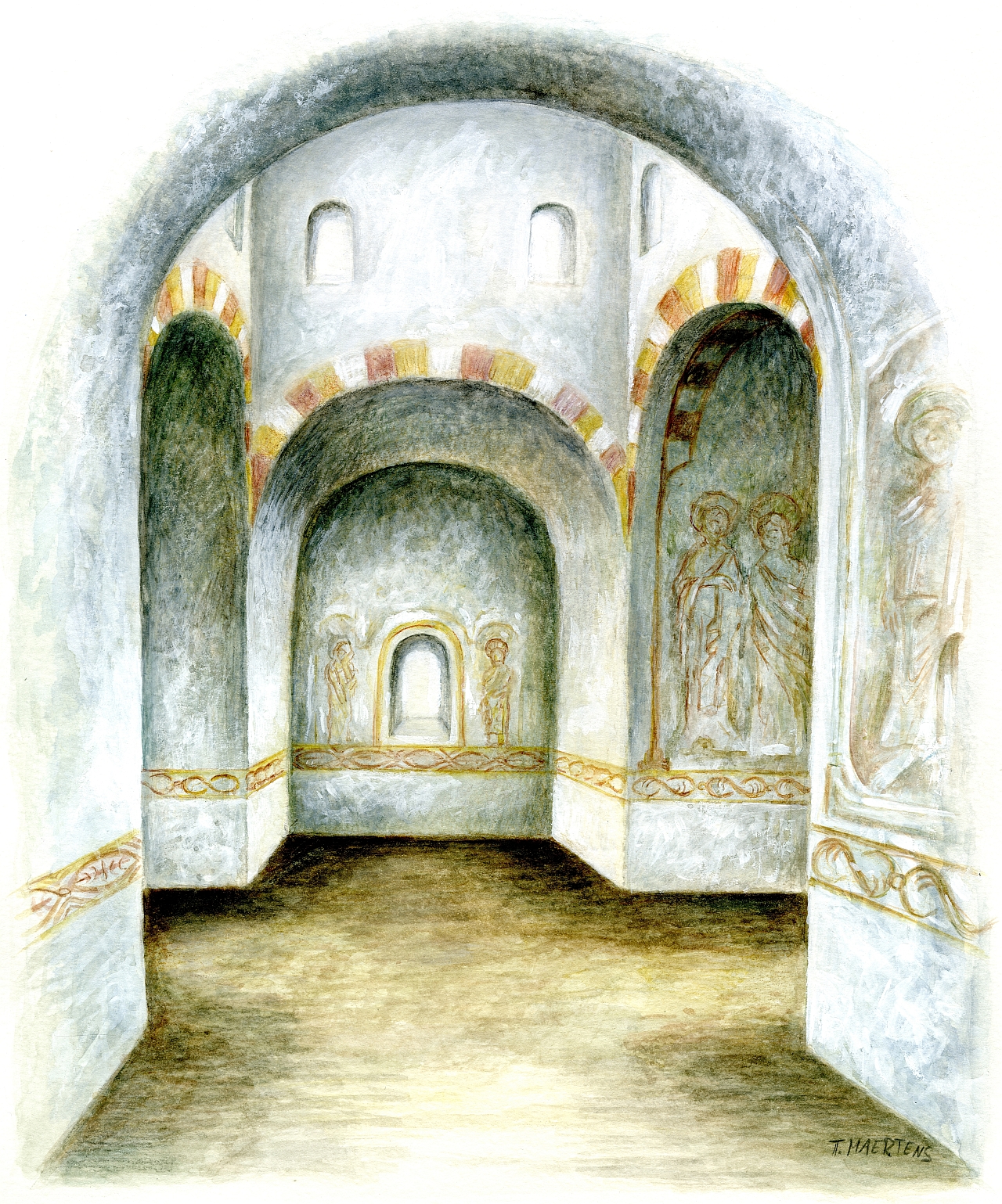 Jene, die einst vor rund tausend Jahren den Anstoß zum Bau der Kreuzkirche gaben, hatten jedoch ein völlig anderes Raumempfinden. Der von Thomas Maertens 2019 zeichnerisch umgesetzte Vorschlag orientiert sich an den Bauformen der damaligen Epoche. Dazu zählen die Rundbögen und die gewölbten Decken. Auch ist davon auszugehen, dass das Bruchsteinmauerwerk verputzt und sehr wahrscheinlich auch freskenmäßig bemalt war. Die Lichtverhältnisse im Inneren vorromanicher und romanischer Sakralbauten waren aufgrund der kleinen Fenster meist sehr gedämpft, völlig im Gegensatz zur späteren Gotik.