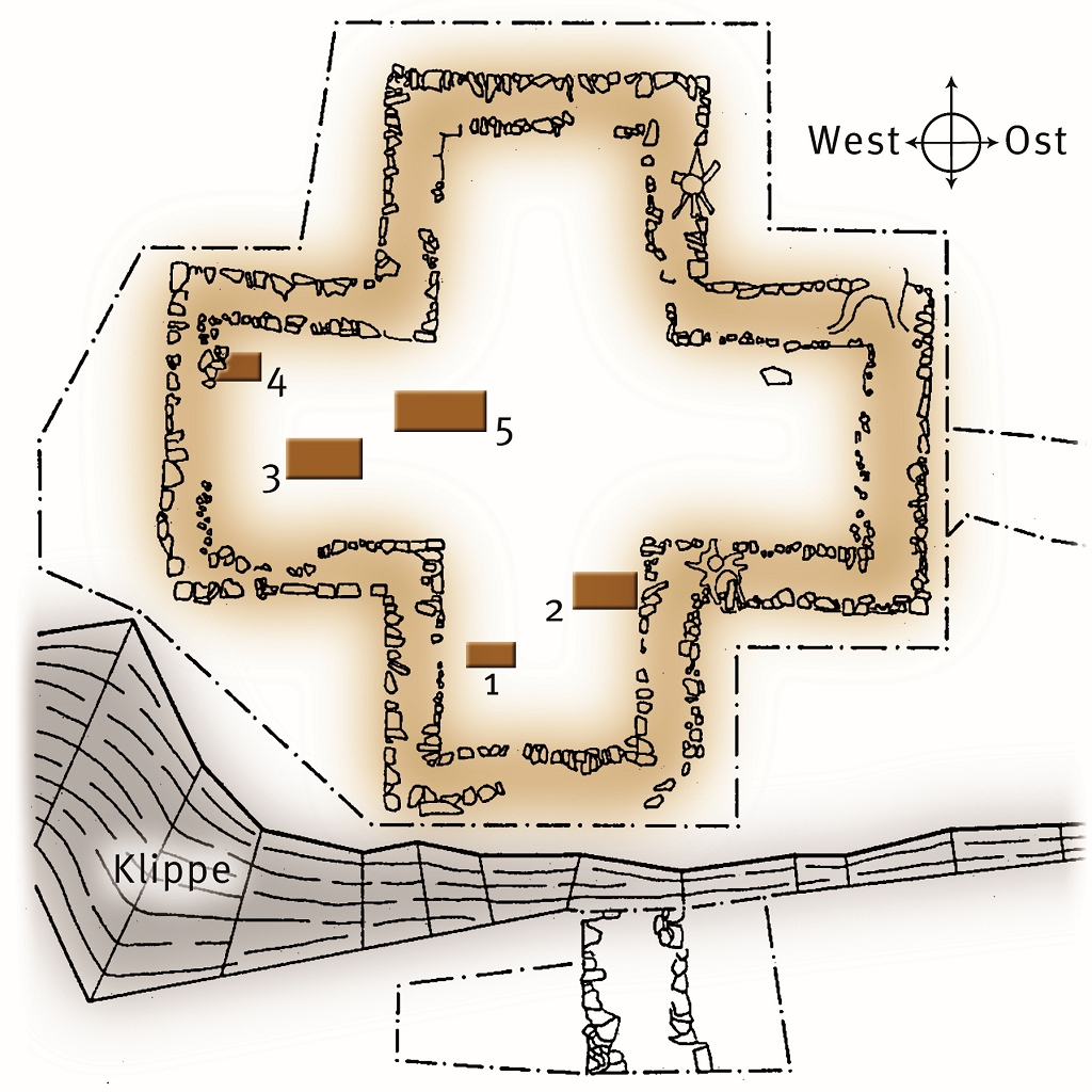 Ein aus kleinen Steinen und Lehm gebildeter Horizont von etwa 0,1 m bis 0,15 m Dicke glich die Unebenheiten des felsigen Untergrunds aus. Es ist unklar, ob es sich bei den aufgefundenen Mauern um Grundmauern handelt oder ob sie auch Bestandteile des Aufgehenden waren.
