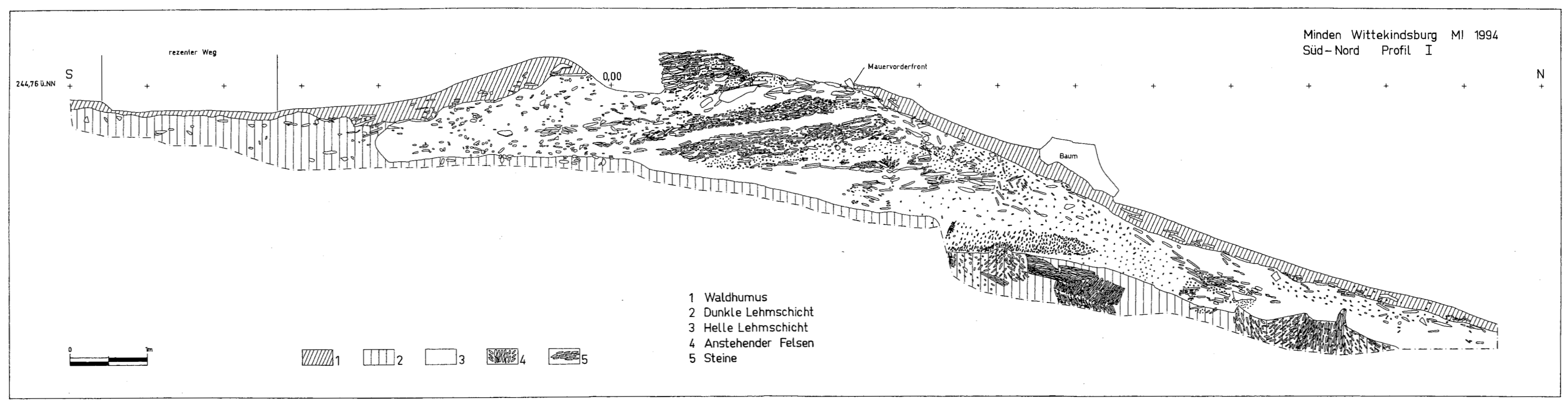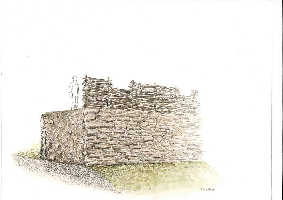An der Außenseite des Walls fand sich eine 0,65 m tiefe künstliche Versteilung des Hanges im anstehenden Felsen. Die Reste der Mauer bestanden aus zwei Lagen plattiger Steine von etwa 0,90cm Höhe. Unterhalb und zwischen den Steinlagen fanden sich hellere Lehmschichten. Die ehemalige Mauerfront war im Norden deutlich erkennbar. Weitere verstürzte Mauerteile fanden sich hangabwärts. Im westlich gelegenen Schnitt wurde ein flacher Sohlgraben beobachtet. Es waren zwar keine Spuren von Holzeinbauten erhalten, doch die verstürzten Mauerreste deuten darauf hin, dass es ursprünglich eine hölzerne Stabilisierung des Erdwalls gegeben haben muss