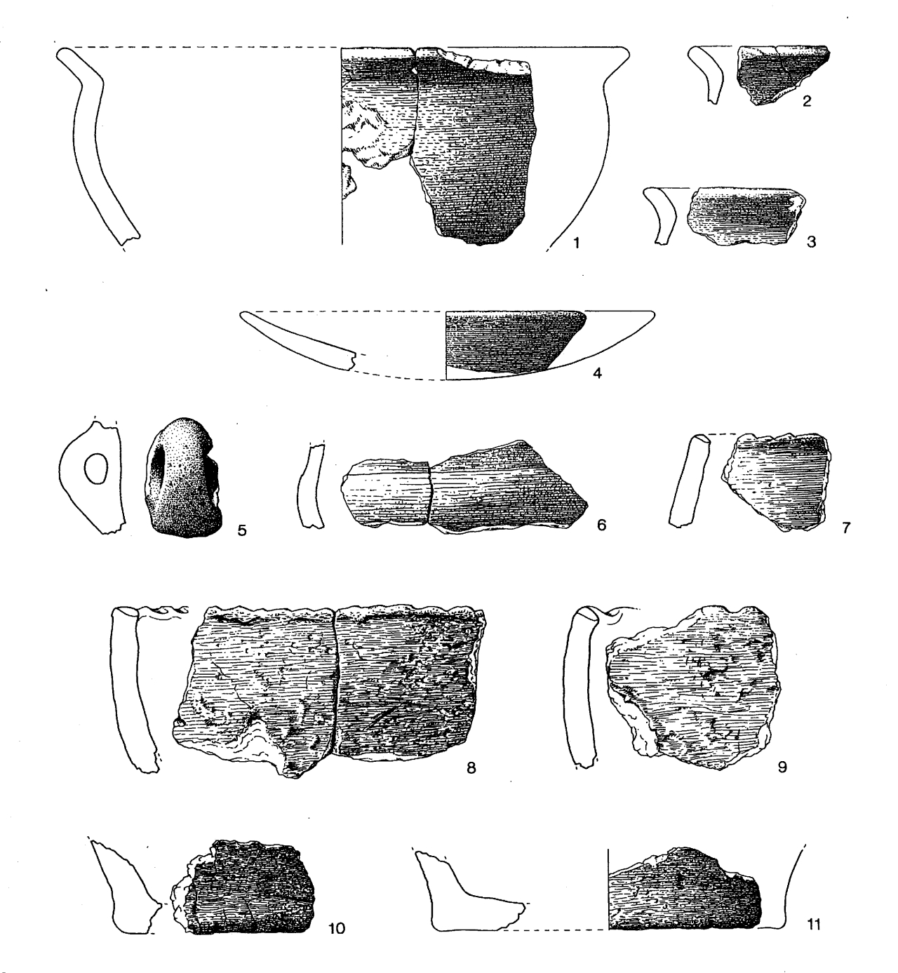 Bei der Keramik handelt es sich um dunkelgraue, gut geglättete Scherben von sog. Schrägrandschüsseln und um dickere, unsorgfältig geglättete Scherben von sog. Harpstedter Rauhtöpfen. Die Rauhtöpfe sind teilweise mit Fingernageleindrücken auf den Rändern verziert. Sie eignen sich jedoch nur bedingt für eine Datierung, da dieser Typ in verschiedenen Varianten in der gesamten vorrömischen Eisenzeit verwendet wurde. Etwas genauer kann die Feinkeramik datiert werden – in das 3./2. Jh. v. Chr.